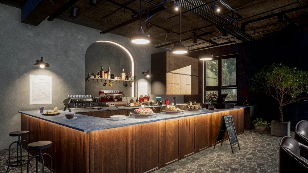 - 落ち着いたカフェ:暖色照明+木目素材